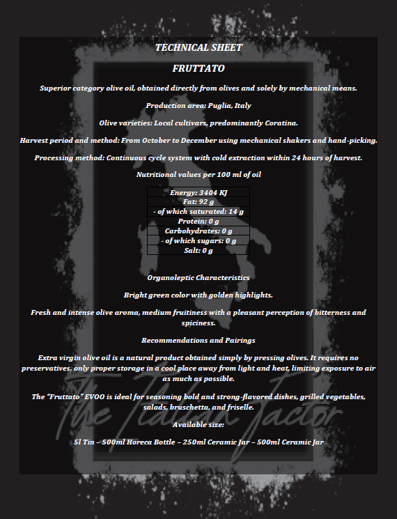 Cold-pressed from hand-harvested olives in Puglia, our Fruttato EVOO delivers a robust, fruity flavour with distinctive bitter and peppery notes. Rich in polyphenols, Vitamin E, and oleic acid, it meets EU nutraceutical standards—making it as healthy as it is flavourful. Perfect for raw dishes, grilled vegetables, meats, or a slice of rustic bread.