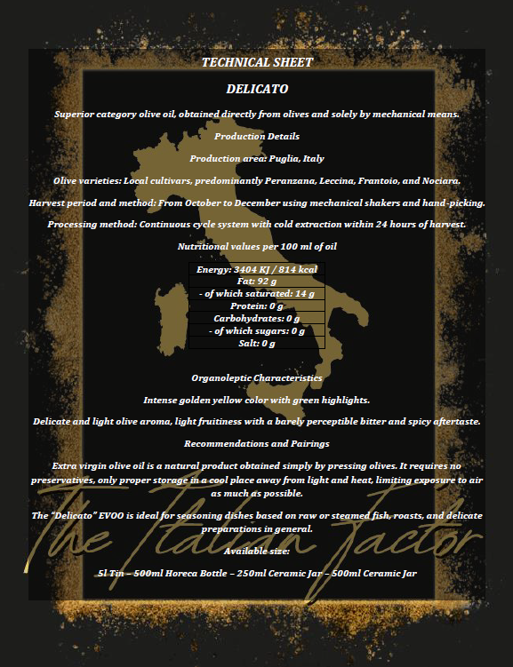 Crafted from a blend of Italian olives like Peranzana and Leccina, our Delicato EVOO is cold-pressed within 24 hours of harvest to preserve its delicate aroma and smooth golden hue. With subtle fruity notes and a whisper of bitterness, it enhances fish, steamed vegetables, and light cuisine without overpowering.